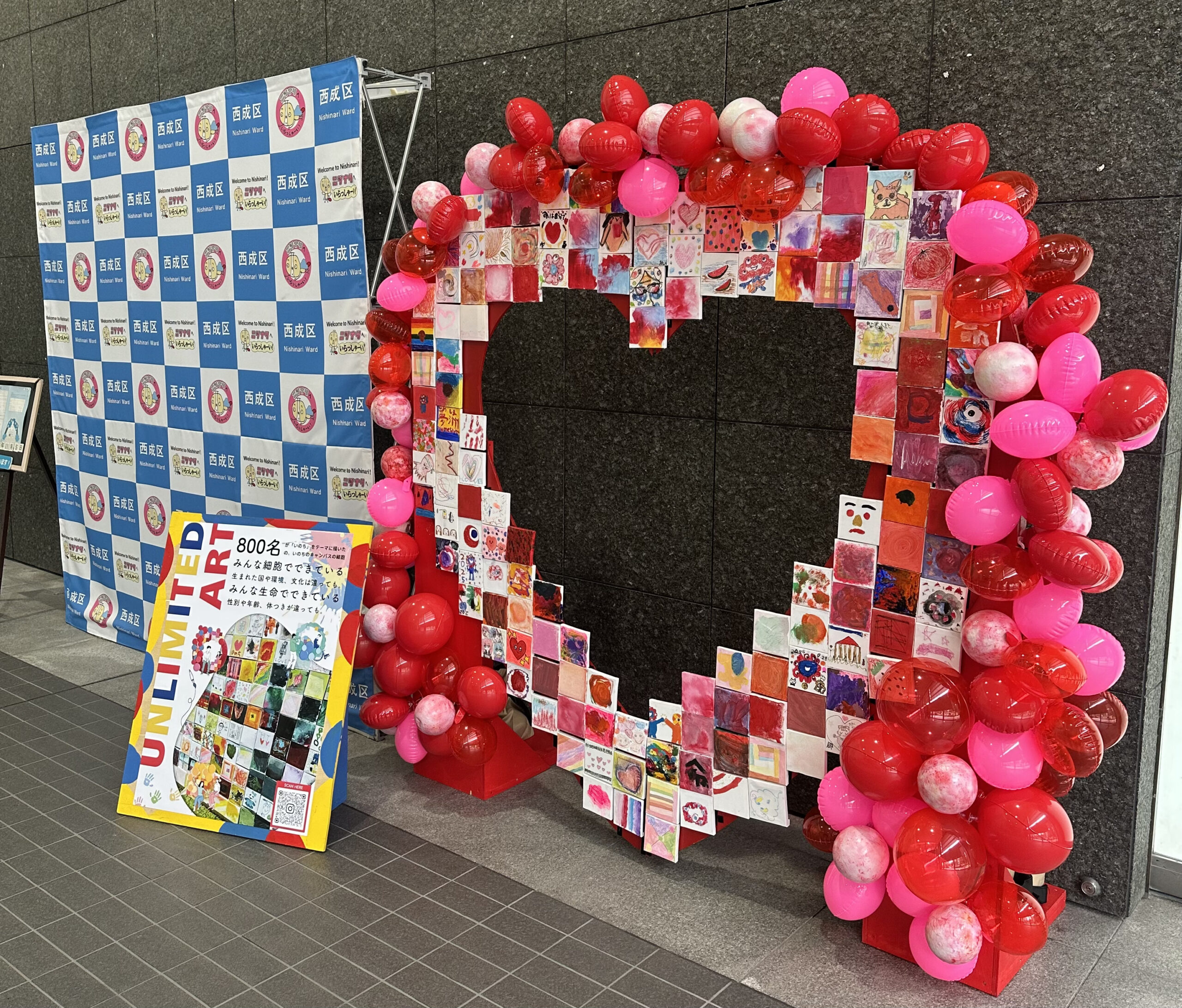 西成区役所のロビーに、色とりどりのアートと風船で彩られた大きなハートのオブジェを展示させていただきました。近くを通る人も思わず足を止めて見入ってしまう、あたたかく華やかな展示です!